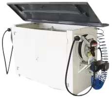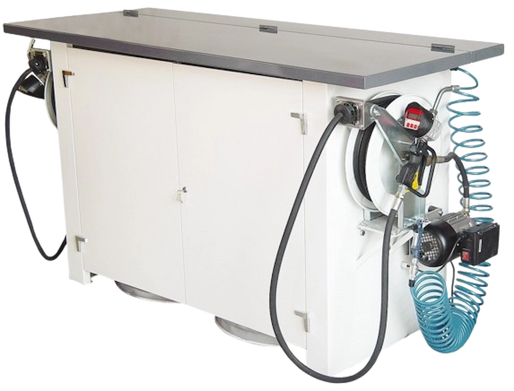 - Modern lubricant dispenser with 2 doors and security lock. The newest open system of the workbench upper part (worktop) makes easier the barrel replacement.